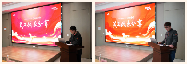 员工是公司发展的基础,会议设置员工代表分享环节。智能陆静、数科刘栋依次登台,分享2026年工作目标与规划,二人目标明确、斗志昂扬,展现了公司员工的担当风貌,也让全体同仁彼此激励、凝聚共识。
